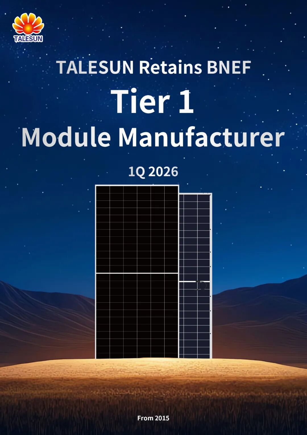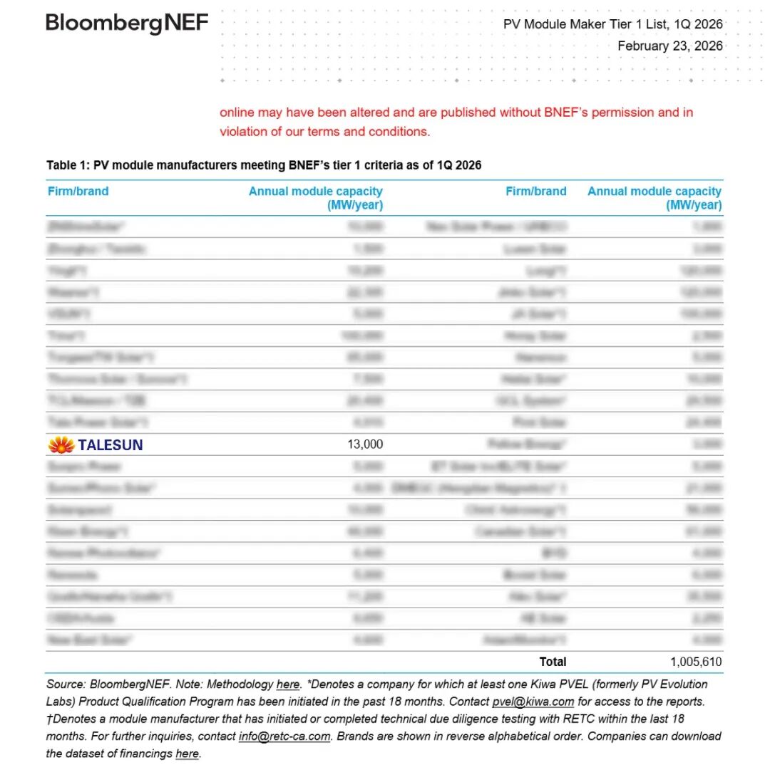 Recently, BloombergNEF (BNEF), the world’s leading authority on energy research, officially released its Q1 2026 global PV module manufacturer?Tier 1?ranking. Backed by exceptional product reliability, robust financial strength, and strong global market performance, Talesun Solar has successfully?retained its Tier 1 position?for another consecutive quarter.